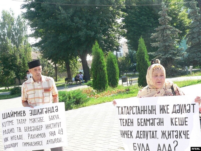 Татар телен яклап пикетка чыгучы Таһир Хәсәновның оныгы урыс мәктәбендә укый икән. Әмма ул татарча укымаса да, туган телендә яхшы сөйләшә, ди пикетчы.