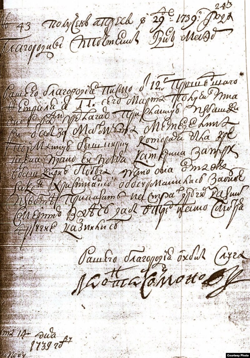 “Пойманную татань-башкирку, которая была крещена и дано ей имя Катерина, за три побега и что она, оставя Закон Христианский, обасурманилась, за оное извольте приказать на страх другим казнить смертию – сжечь, дабы впредь, на то смотря, другие казнились".