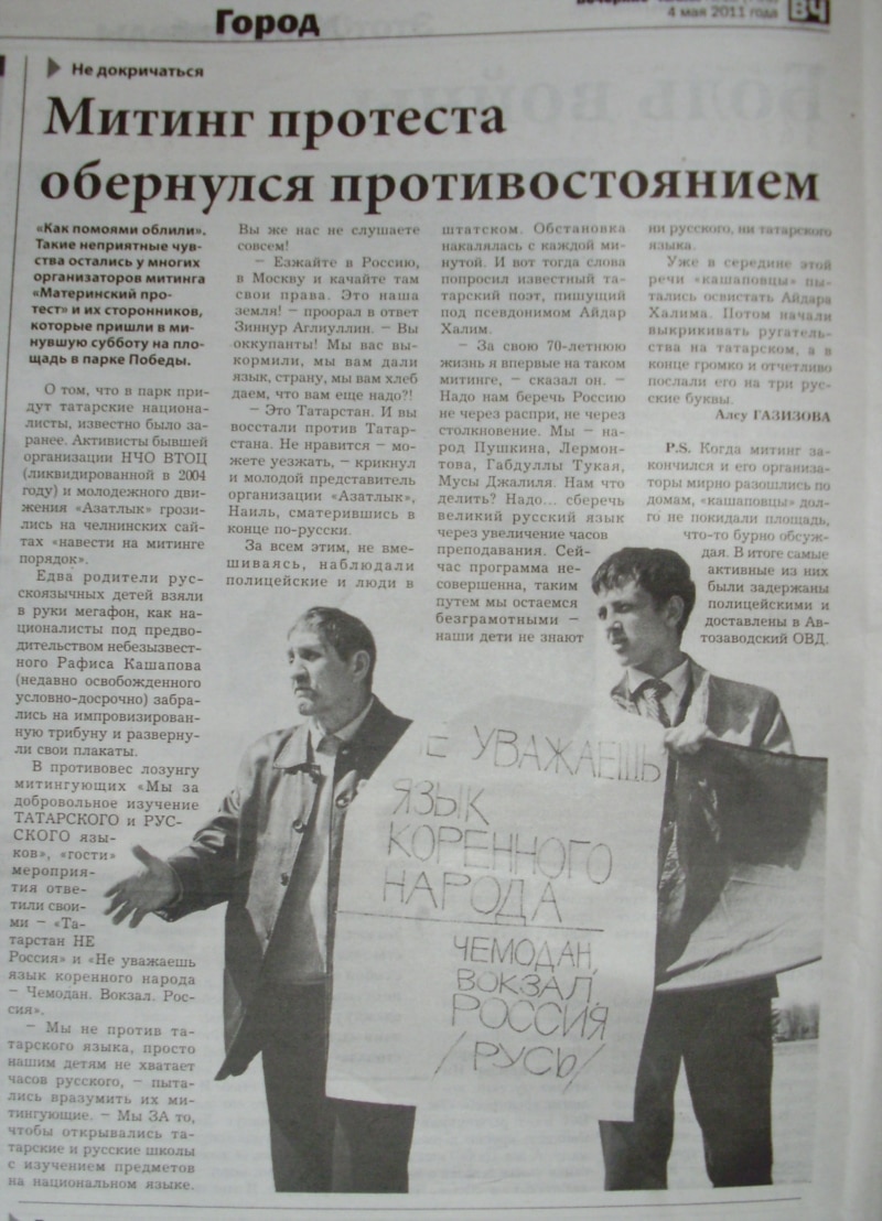 “Бу – Татарстан! Сез Татарстанга каршы чыктыгыз!” дип кычкырды “Азатлык” оешмасының яшь вәкиле Наил. Ул соңыннан урысча сүгенеп тә куйды”, ди “Вечерние Челны”.
