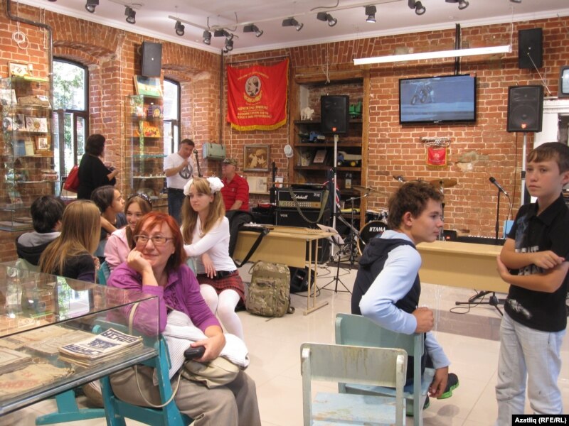 Якты иркен сыйныф итеп бизәлгән бүлмәдә балалар утырган өстәл һәм урындыклар куелган. Түрдә совет чоры телевизорлары һәм магнитофоннар тора.