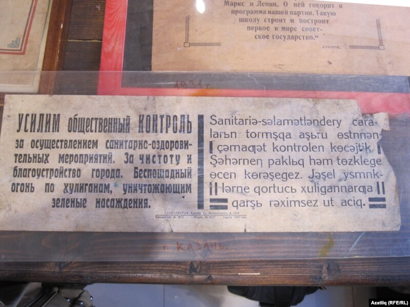 Латин алфавитында басылган белдерүләр аерым игътибар җәлеп итә. Алар урысча һәм татарча басылган булган. Анда "Ашар алдыннан кулны юыгыз", "Шәһәрдә чисталык саклагыз" кебек шигарләр язылган.
