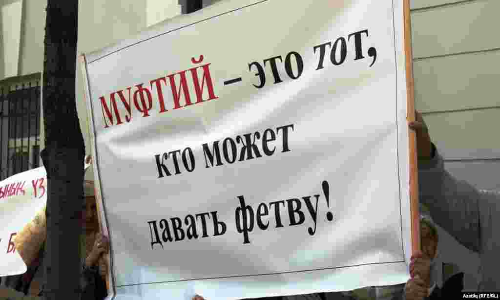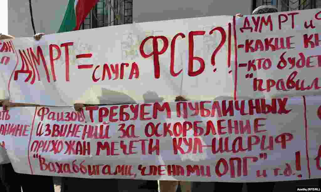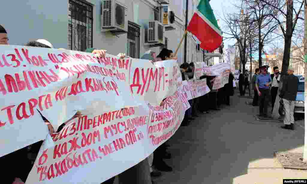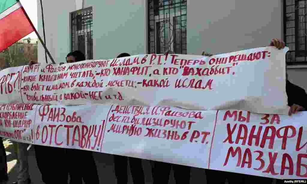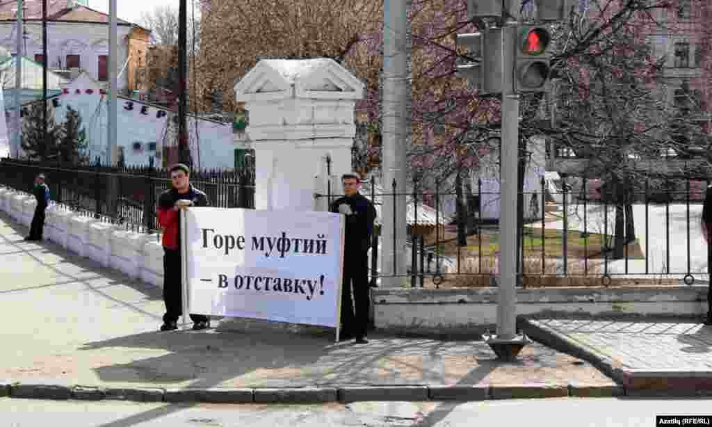 Казанда Татарстан мөселманнарының диния идарәсе бинасы каршында мөфти Илдус Фәизгә каршы пикет узды. Күп кенә шигарьләр күтәреп чыккан мөселманнарның төп таләбе – мөфтинең вазифасыннан китүе иде. Апрель башында Илдус Фәиз “Кол Шәриф” мәчете имамы Рамил Юнысны вазифасыннан алып үзен имам дип игълан иткәннән соң, мөселманнарның мөфтигә карата ризасызлыгы кисәк көчәеп китте. Мөселманнар басымы астында Илдус Фәиз әлеге карарыннан чигенергә мәҗбүр булды. [Рамил Сафин фотолары]