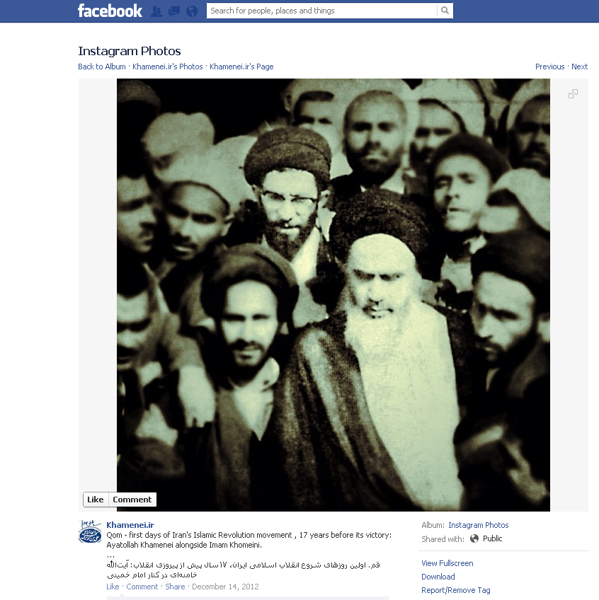 Хаменеинең Facebook сәхифәсендәге бу фотода хәзерге рухи җитәкче (күзлекле) Иран ислам республикасына нигез салган Аятулла Рухалла Хомәйни артында басып тора.