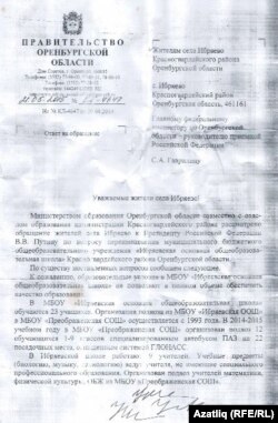 Оренбур өлкәсенең Ибрай авылы халкының апрельдә җыелып район һәм өлкә мәгариф түрәләре, өлкә губернаторы һәм Русия президенты Владимир Путин исеменә татар теле укытылган урта мәктәпне башлангыч белем бирү йорты гына итеп калдыруга ризасызлык белдереп язган хатына җавап килде.