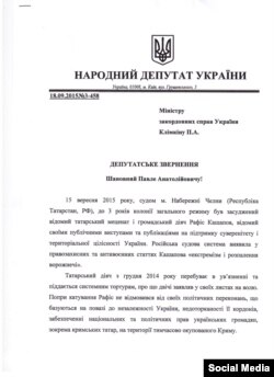 Украина парламентының 15 депутаты тышкы эшләр министры Павел Климкинга Русиянең Рәфис Кашаповны төрмәдән чыгаруын таләп итүен сорап мөрәҗәгать итте. Татар милли хәрәкәте җитәкчеләренең берсе Русиянең Кырым аннексиясенә каршы чыгуы турындагы язмалары өчен инде бер ел төрмәдә утыра. 15 сентябрь ул 280нче маддәнең икенче өлеше, 282нче маддәнең беренче өлешләре нигезендә илне җимерүгә чакыру, экстремизм һәм терроризмда гаепләнеп хөкем ителде. Украин депутатлары үз хатларында Кашаповка гына түгел, тоткында калучы башка активистларга да теләктәшлек белдерә.
