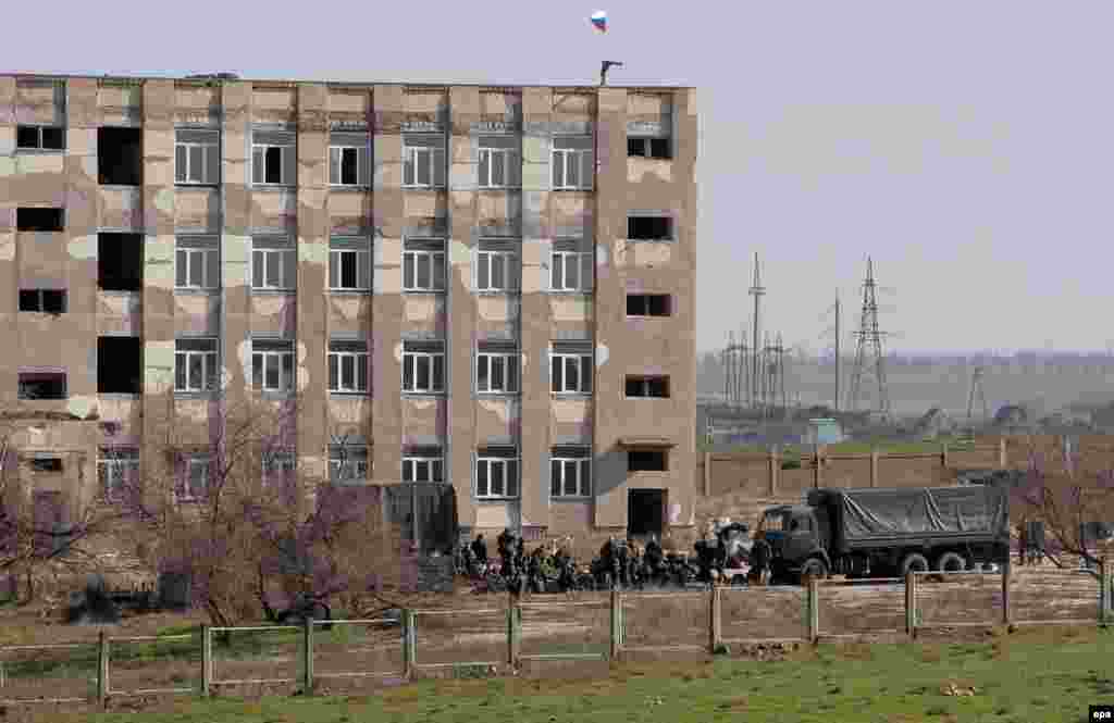 Акъярда (Севастополь) Украина хәрби базасы янына килгән кораллы кешеләр.