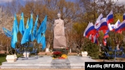 Шул ук көне Акмәчеттәге Гаспринский һәйкәле янына кырымтатар җәмәгатьчелеге тупланды. Монда инде һәйкелнең бер ягында кырымтатар байраклары, икенче ягында Русия байраклары урнаштырылган иде.