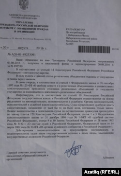 Рәфис Кашаповка Русия президенты идарәсеннән 30 августта А.Иванов имзасы белән җавап хаты юлланган. Хаттан күренгәнчә, җавап бик гомум, рәсми һәм шактый буталчык. Русия президенты идарәсеннән Рәфис Кашаповка җибәрелгән хатта "Русия мәхкәмәләре хөкем эшләрен кемнең дә булса ихтыярыннан бәйсез рәвештә, гадел, бары тик канунга буйсынып башкара" дигән гомум сүзләрдән әйтелә. А.Иванов әфәнде имзалаган хатта диннең дәүләттән аерылган, Русиянең дөньяви дәүләт булуы, Русиядә мәхкәмәләрнең мөстәкыйль, бик гадел булулары да турында әйтелә. Тик бу җаваплар Рәфис Кашапов күтәргән конкрет проблемнарга ни рәвештә җавап бирә икән дигән сорау туарга мөмкин.