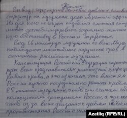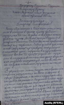 "Будда дине, коммунистик режим хакимлек иткән Кытайда да мөселманнар өчен телеканаллар эшли, башкала булган Пекинда җитмешләп мәчет бар. Мәскәүдә бары алты мәчет эшли. Русия мәгариф системасында яулыклар бәйләү тыела. Русия төбәкләрендә мәчетләр төзергә, мөселман зиратлары өчен җирләр бирүдә даими каршылыклар күрсәтеп, проблемнар тудыралар. Мәхкәмәләр мөселман китапларын юк итү турында карарлар чыгара. Төрле сәбәпләр табып мәхкәмәләр мөселманнарга карата ялган эшләр ача, аларны төрмәләргә утырта. Шушындый басымнар нәтиҗәсендә меңәрчә кеше чит илләргә китәргә мәҗбүр, кайберләре “Ислам дәүләте” өчен сугыша. ФСБ башлыгы Александр Бортниковның Сүриядән, Әфганстан һәм Гыйрактан кайткан өч меңләп сугышчының Русиягә куркыныч тудыруы турындагы сүзләрен “Российская газета” яза. Күрәбез, көч структуралары басымы бары тискәре нәтиҗәләр генә бирә. Хакимиятләргә Русиядәге 25 миллион мөселманның проблемнарын чишү зарур. Алар үзләрен чын ватандашлар итеп хис итәргә тиеш” диелә Путин исеменә язылган хатта.