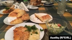 Корылтай делегатлары һәм кунаклары төшке ашны "Казан" милли-мәдәни үзәгендә ашады. Өстәлләр мул күренә, татарлар сыйлый да, сыйлана да белә.
