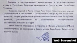 Әлеге хатны Фәттахов 19 февраль имзалаган. Хат почта белән "Иман" ислам мәдәнияте үзәгенә 23 февраль килеп җиткән. Хатта Казанда дүләт, муниципаль һәм шәхси музейларның канун кысаларында гына ачыла алулары турында әйтелә һәм ул таләпләр санала. Бүген шәһәр карамагында алты музейның эшләве белдерелә.
