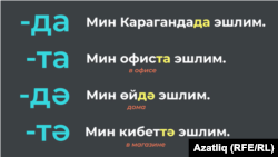 Если слово заканчивается на звонкую согласную или гласную, то добавляем окончание -да/-дә. Если же на глухую согласную, то -та/-тә. Надеемся, вы помните, когда добавлять твердые окончания, а когда – мягкие. Если нет, вспомните это из второго урока.