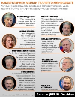 18 март Русия президентын сайлауда кемгә тавыш бирергә дип икеләнүчеләр өчен намзәтләрнең кайбер мөһим мәсьәләләргә карашларын чагылдырган кыскача белешмә әзерләдек. Игътибарга аларның милли телләргә мөнәсәбәте, төбәкләр вәкаләтләре, тышкы сәясәт, Кырым һәм мәгариф турында фикерләре алынды.