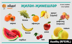 Җиләк – ягода/виктория, кура җиләге – малина, карбыз – арбуз, чия – вишня, кызыл карлыган – красная смородина, алма – яблоко, гранат – анар