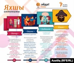 - Кабахәт – “скверный, мерзкий”, является одним из самых употребимых антонимов в татарской речи. Слово означает, что человек и его поступки настолько ужасны, что его сложно назвать даже человеком и говорят “кабахәт”. Антоним используется при случаях указания: негативного поведения и действия (кабахәтлек кылу – поступить мерзко, кабахәт кыланыш – омерзительный поступок, кабахәт эш – скверное дело); чего-то абстрактного (кабахәт гайбәт – мерзкие слухи, кабахәт тәкъдим – мерзкое предложение).