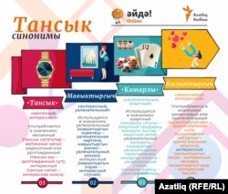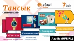 - Тансык – “желанный, интересный”, употребляется в значениях: желанный (тансык сәгатьләр – желанные часы, тансык яңалык – желанная новость, тансык бала – желанный ребенок); редкостный или долгожданный (тансык аш – долгожданный суп, тансык балык – редкостная рыба); интересный (тансык китап – интересная книга, тансык вакыйга – интересное событие).