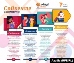Мөлаем (ласковый, милый) употребляется в значениях: ласковый (мөлаем күз карашы – ласковый взгляд, мөлаем карт – ласковый старик, мөлаем ата – ласковый отец); милый (мөлаем елмаю – милая улыбка, мөлаем песи – милый котик, мөлаем егет – милый парень, мөлаем төш – милый сон).