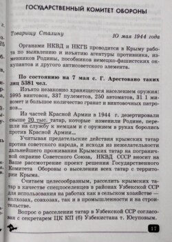 1944 елның 11 маенда совет җитәкчесе Иосиф Сталин "Кырымтатарларны Кырымнан сөргенгә җибәрү турында" карар имзалый. Бу карарда кырымтатарлар "фашист ярдәмчеләре" дип тамгалана.