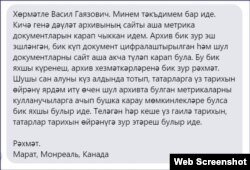 "Кичә генә дәүләт архивының сайты аша метрика документларын карап чыккан идем. Архивта бик зур эш эшләнгән, бик күп документ цифралаштырылган һәм шул документларны сайт аша акча түләп карап була. Бу бик яхшы күренеш, архив хезмәткәрләренә бик зур рәхмәт. Шушы сан алуны күз алдында тотып, татарларга үз тарихын өйрәнү ярдәм итү өчен шул архивта булган метрикаларны кулланучыларга ачып бушка карау мөмкинлекләре булса, бик яхшы булыр иде. Теләгән һәр кеше үз гаилә тарихын, татарлар тарихын өйрәнүгә зур этәргеч булыр иде", дип язды ул Zoom чатында.