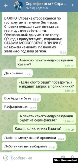 Русия куәт структураларының контролендә булмаган дип саналучы Telegram каналларда ялган сертификатлар табу - иң җиңеле. Беренче итеп "КУПИТЬ🔥СПРАВКУ🔥 КАЗАНЬ" дип аталган төркемгә юлыгасың. Анда 200дән артык кеше утыра. Модератор белән сөйләшү барышында аларның бөтен Русия һәм Украина буйлап эшләве билгеле булды. Казан хастаханәләренең мөһере сугылган сертификат та бирүләрен әйттеләр.
