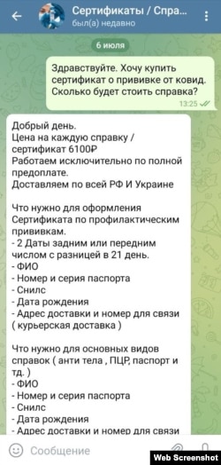 Икенче Telegram каналда вакцина сертификатларын 5 800 сумга ясарга тәкъдим иттеләр. Алар Казан хастаханәләрендә үз кешеләре булуын сөйләде.