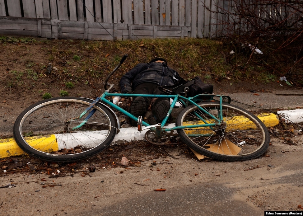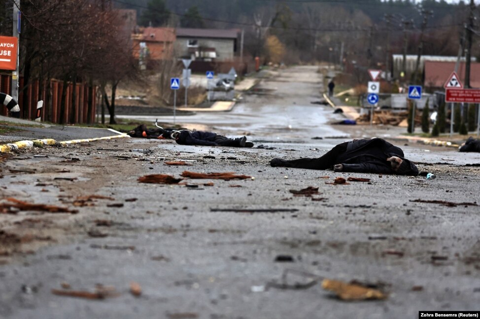 Украина президенты идарәсенең башлыгы киңәшчесе Михаил Подоляк та үтерелгән кешеләр фотоларын интернетка чыгарды һәм бу хәлне Европага кайткан "нацизмның иң куркыныч җинаятьләре" дип атап Русиягә гаепләү белдерде. Русия бу фотоларны "фейк" дип атады.
