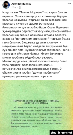 "Илдә тагын "Павлик Морозов"лар кирәк булган ахрысы. Соңгы көннәрдә ил күләмендә бердәм балалар оешмасын торгызу эше Татарстаннан Мәскәүгә күченгән Дамир Фәттаховка йөкләнеләчәк дигән хәбәр йөри. Совет берлеген җимерелүдән бер партия хөкүмәте, комсомол һәм балаларның пионер оешмасы коткара алмагач, хәзер дә "патриотизм вертикален" торгызу бушка гына булачак. Бюджетка да зыян киләчәк – меңнәрчә кеше берәр файдалы эш урынына буш сүз сөйләп, шуңа акча алып ятачаклар. Тагын нәрсә дип әйтмәкче булам – безгә балаларга милли тәрбияне өйдә бирергә кирәк. Мәктәпләрдә азат, уйлый торган кешеләр бетеп бара диярлек, балаларның башларын катырачаклар акылсыз пионерлык белән. Ә өйдәге милли тәрбия "дәүләт тәрбиясенә" күпмедер дәрәҗәдә каршы тора ала", дип яза Азат Сәйфетдин.