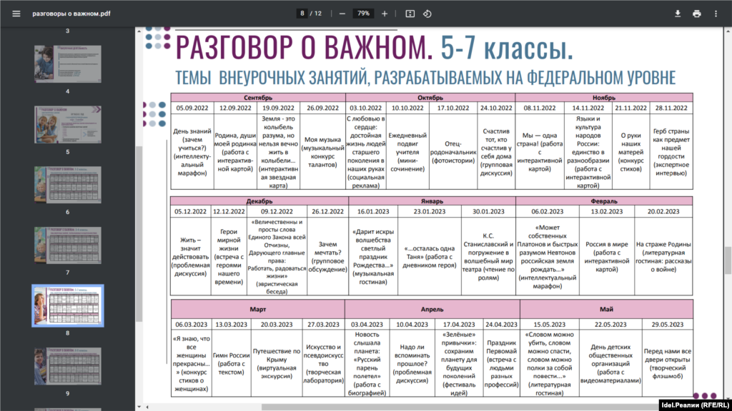2022 елның 1 сентябреннән Русиянең барлык мәктәпләрендә "дәрестән тыш эшчәнлек кысаларында" яңа факультатив курс кертелә. "Мөһим әйбер турында сөйләшүләр" дип аталган бер елга сузылган курс "патриотик, әхлакый һәм экологик юнәлештәге" дәресләр циклы дип тасвирлана. Русиянең Мәгариф һәм фән министрлыгы хәзер аның кулланмасын барлык төбәкләргә тарата. Яңа кулланмада экология әллә ни күп түгел, аның каравы "патриотизм" һәм "әхлаклылык" төшенчәләре тулып ята.