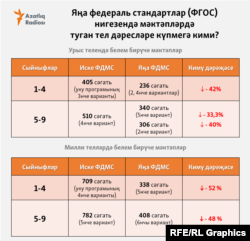 - Документта төрле дәрәҗәдәге мәктәпләр өчен кайсы сыйныфта кайсы фәннең, шул исәптән туган телләр, республиканың дәүләт телләре кебек дәресләрнең дә атнасына ничә сәгать укытылырга тиешлеге билгеләнә.