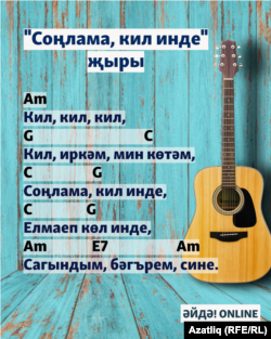Кил, кил, кил, Кил, иркәм, мин көтәм, Соңлама, кил инде, Елмаеп көл инде, Сагындым, бәгърем, сине. |