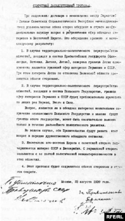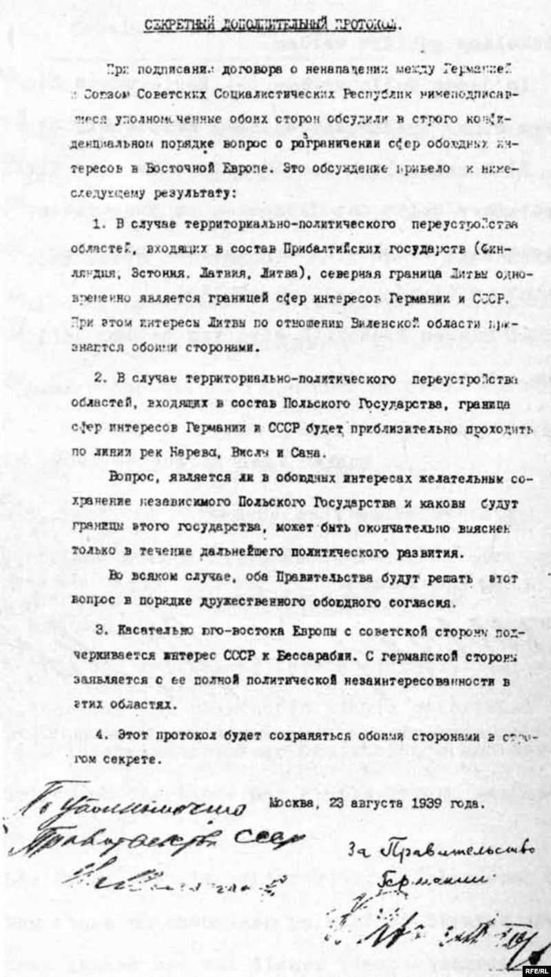 1939 елның 23 августында совет һәм Германия тышкы эшләр министрлары Йоахим фон Риббентроп белән Вячеслав Молотов имзалаган үзара һөҗүм итмәү турындагы килешүгә яшерен беркетмә өстәлгән була.
