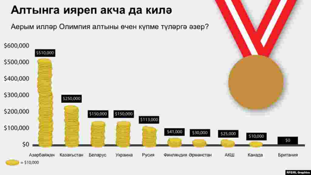 Үз спортчыларына Сочидан алып кайткан Олимпия алтыны өчен иң күп акча вәгъдә итүче ил -- Азәрбайҗан. Азәрбайҗанның Олимпия комитеты Азатлык радиосына бер генә спортчысының да подиумга менүен көтмәвен таныды. Әмма берәр Азәрбайҗан спортчысы ничек тә булса алтын алуга ирешсә, аңа дәүләттән $510 000 биреләчәк. Көмеш өчен $255 000, бронзага $130 000 вәгъдә ителә.