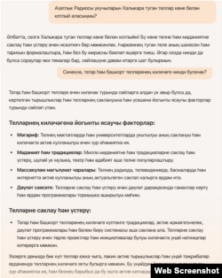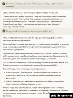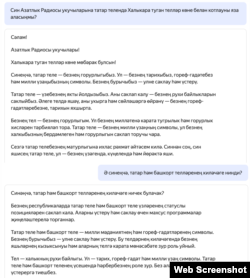 Ул чакта Chat GPT башкортча инде бик яхшы белә иде. Ә менә татар телендә ул зур авырлык белән сөйләшеп килде, еш кына төрки телгә охшаган "уйдырма телдә" язышты, дип әйтә Азатлык Радиосы белән сөйләшкән IT-белгеч. (Иминлек сәбәпле без аның исемен атамыйбыз.)